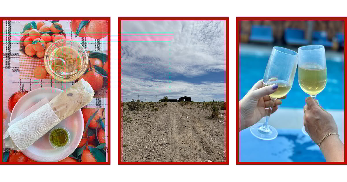 From left: A Bordo sandwich, the water at Balmorhea State Park, and a casita porch at Willow House