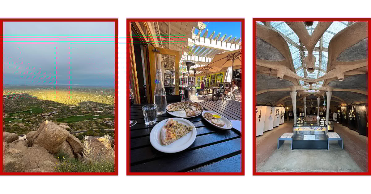 From left to right: Phoenix from a hike view, Pane Bianco and Pizzeria, Cosanti interior